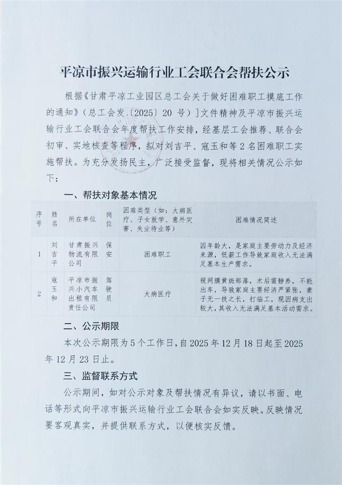 平?jīng)鍪姓衽d運輸行業(yè)工會聯(lián)合會幫扶公示